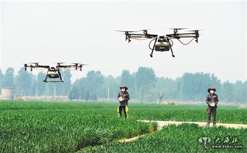 植保人员在河北省泊头市交河镇陈北村操作无人机给小麦喷洒农药。新华社记者牟宇摄