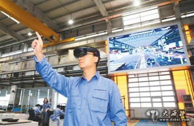 工作人员在中国商飞公司总装制造中心使用AR眼镜操控虚拟电子屏幕。