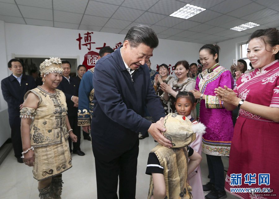 习近平在黑龙江同江市八岔村,同身着民族服装,正在学习赫哲族特有的伊玛堪说唱艺术的村民们亲切交流。