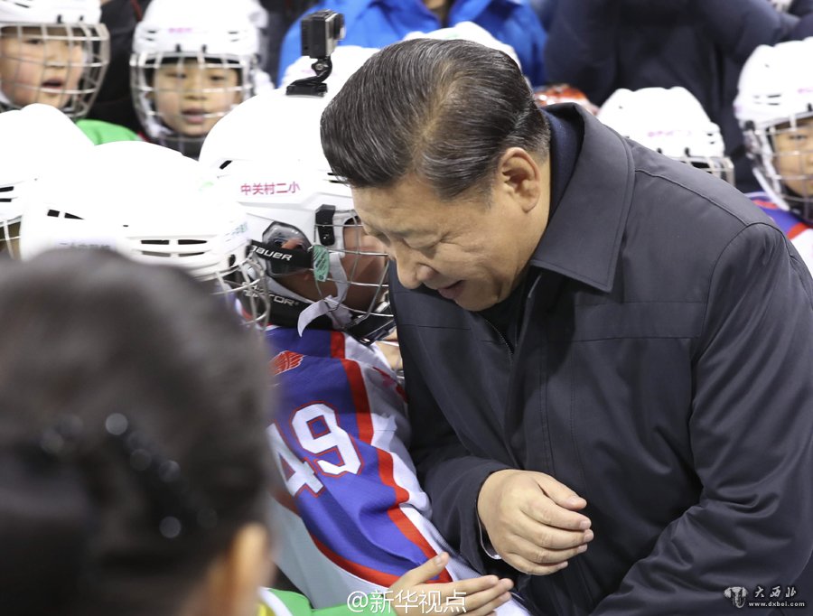 在北京五棵松体育中心,习近平拉着一位小冰球队员的手,俯下身,与他肩碰肩,做了一个“对抗”的姿势,笑着说,小伙子块头要再长大一点。