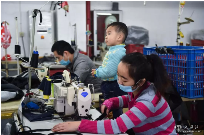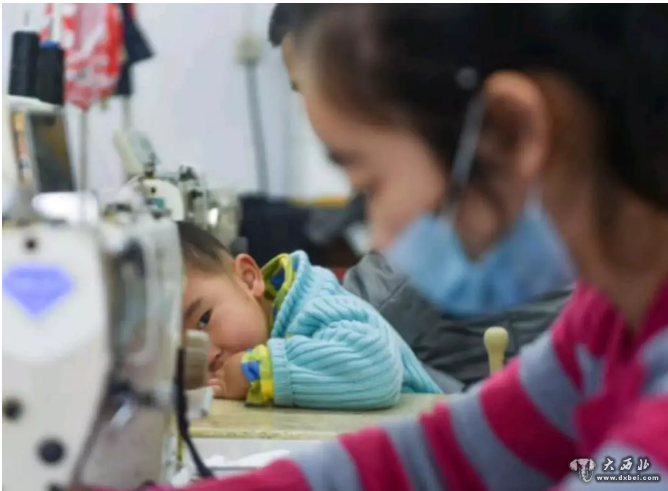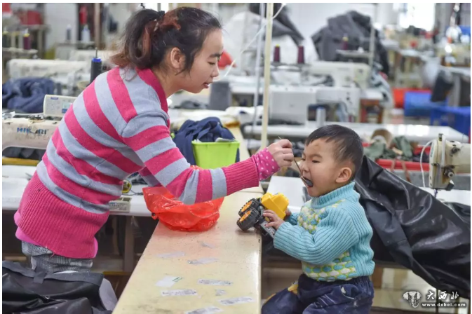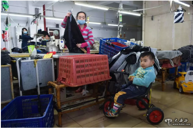 1月11日,在福建省石狮市金利莱斯服装厂,黄爱华(右二)在工作之余照看在旁边骑玩具车的聪聪。