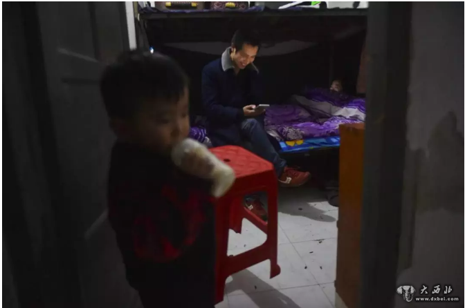 1月31日,在福建省石狮市金利莱斯服装厂工人宿舍,聪聪的父母黄海龙(中)、黄爱华忙碌了一天正在休息,聪聪在宿舍门口喝奶。