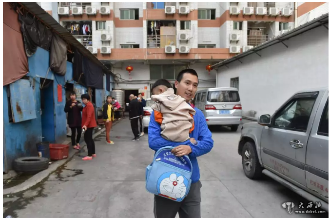 4月18日,在福建省石狮市金利莱斯服装厂,黄海龙抱着睡眼惺忪的聪聪走出工厂,准备乘坐校车去幼儿园。