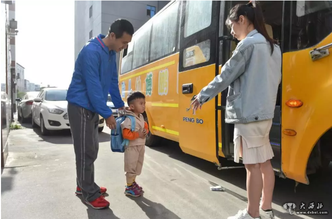 4月18日,在福建省石狮市金利莱斯服装厂门口,黄海龙(左)将聪聪送上去往幼儿园的校车。