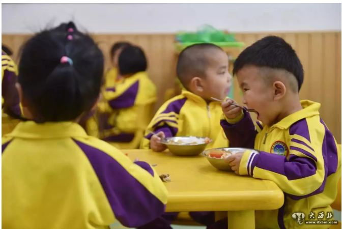 4月17日,在福建省石狮市鹏博幼儿园,刚刚入园一个月的聪聪(右一)在吃饭。