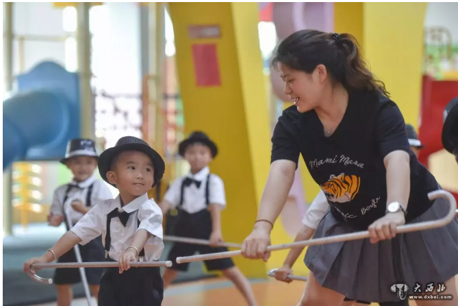 5月31日,在福建省石狮市鹏博幼儿园,聪聪(左)跟着老师林慧芬排练“六一”节目。