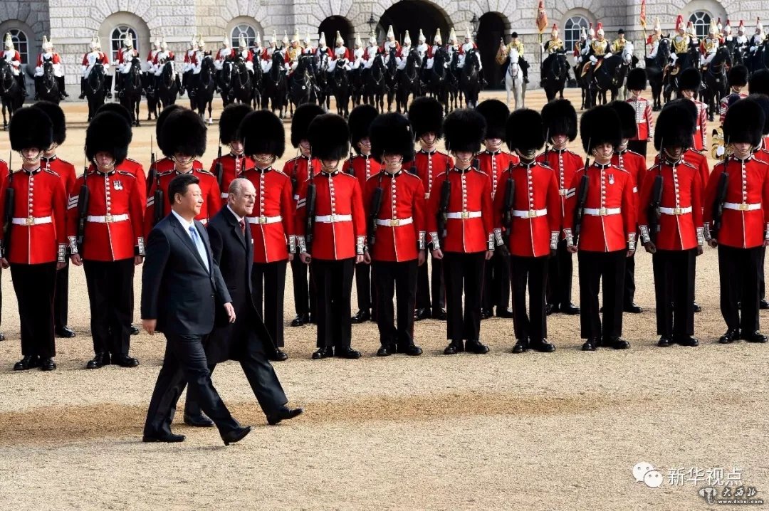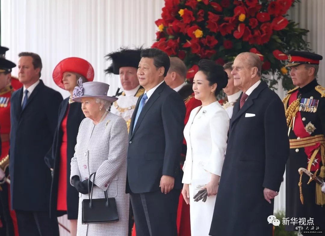 习近平主席夫妇登上皇家检阅台,伊丽莎白二世女王和丈夫菲利普亲王迎接。随后,在菲利普亲王陪同下,习近平主席检阅了仪仗队。