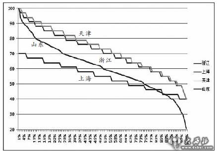 关于赋分,各省市改革方案中的规定也不尽相同,如图可以看到,山东省的赋分制度区分度显著增加。