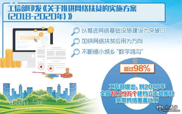 工业和信息化部网站6月6日显示,工信部近日印发《关于推进网络扶贫的实施方案(2018—2020年)》,要求以推进网络基础设施建设为突破口,加快网络扶贫应用为方向,不断缩小城乡“数字鸿沟”。《方案》提出,到2018年,国家“十三五”规划纲要明确提出的“宽带网络覆盖90%以上的贫困村”目标提前完成;到2020年,全国12.29万个建档立卡贫困村宽带网络覆盖比例超过98%。