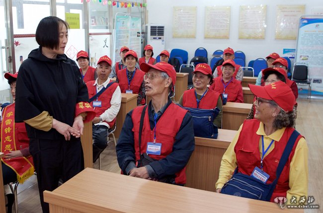6月5日,姜士发(右一)和廉士芳在延安路街道明霞路社区服务中心集合,准备参加志愿者培训。