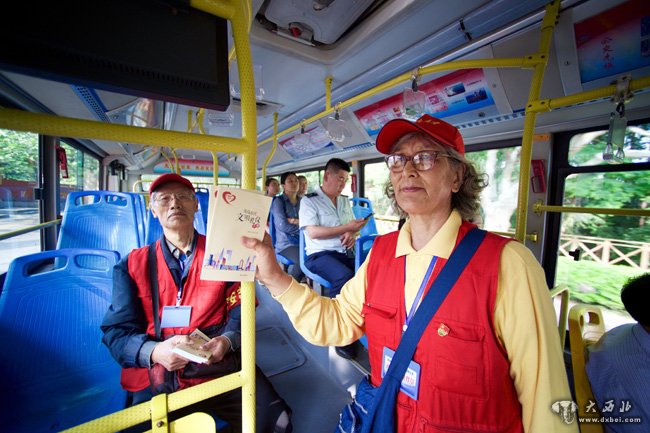 6月5日,姜士发(左)和廉士芳乘坐公交车前往志愿服务地点。