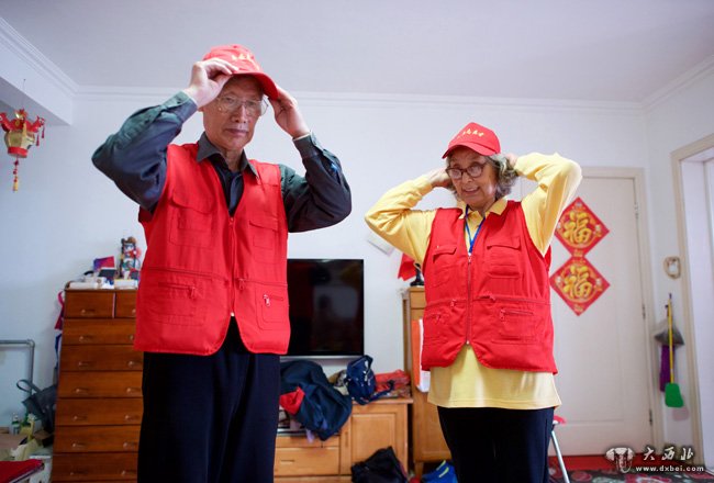 6月5日,姜士发(左一)和廉士芳在家中穿戴志愿者服装。