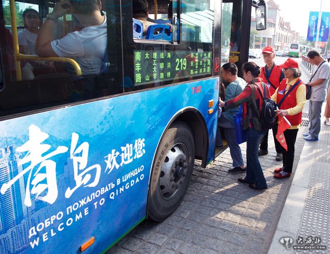 6月5日,姜士发(右三)和廉士芳在青岛文登路一公交站进行交通引导志愿服务。