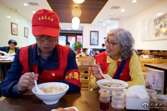 6月5日,在志愿服务间隙,姜士发(左)和廉士芳在一家馄饨店用晚餐。