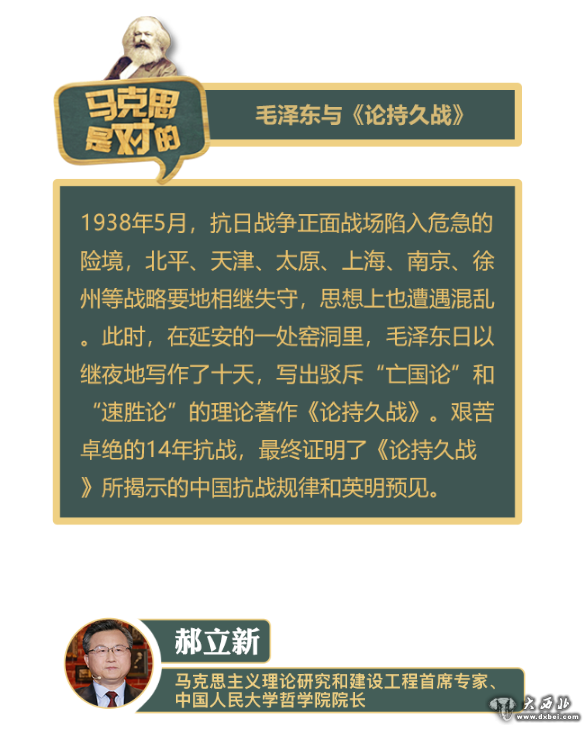 毛泽东同志说过一句话,他说:“马克思主义有几门学问,但基础的东西是马克思主义哲学。这个东西如果没有学通,我们就没有共同的语言,没有共同的方法,扯了许多皮,扯还扯不清楚。有了辩证唯物论的思想,就省了许多事,也少犯许多错误。”《论持久战》就是一个十分典型的例子。这部著作分析了中日双方相互矛盾着的四个基本特点,它就是敌强我弱、敌小我大、敌退步我进步、敌寡助我多助。根据这些特点的分析,就作出了中国不会灭亡,也不能速胜。只要经过艰苦、持久的抗战,最后的胜利一定属于中国的这样一个正确的结论,这就为中国人民的抗日战争指明了胜利的方向。