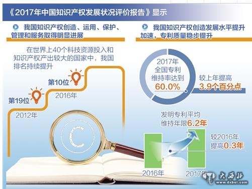 经济日报北京6月12日讯记者李芃达报道:《2017年中国知识产权发展状况评价报告》今日在北京发布。《报告》显示,2017年,我国知识产权创造、运用、保护、管理和服务等各项工作取得明显进展,知识产权综合发展指数为218.3(以2010年为100),比上年增长9.0%,保持较高增速。在世界上40个科技资源投入和知识产权产出较大的国家中,我国知识产权发展状况排名从2012年的第19位提升至2016年的第10位。我国知识产权综合发展水平不断提高,与知识产权强国差距进一步缩小。