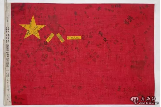 △30年前,海军511舰官兵面向军旗宣誓,并投放宣示南海主权的“舰铭牌”,这是南海主权宣誓时的签名军旗(收藏于军事博物馆)