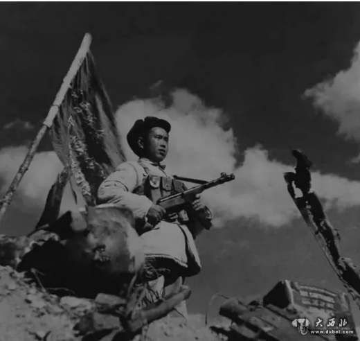 △志愿军第15军官兵将布满381个弹孔的战旗插在上甘岭主峰阵地