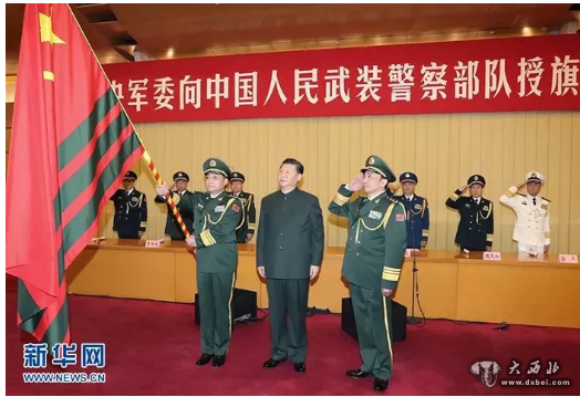 △2018年1月10日,中央军委向武警部队授旗仪式在北京八一大楼举行,习主席向武警部队授旗并致训词。