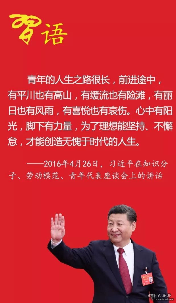 青年的人生之路很长,前进途中,有平川也有高山,有缓流也有险滩,有丽日也有风雨,有喜悦也有哀伤。心中有阳光,脚下有力量,为了理想能坚持、不懈怠,才能创造无愧于时代的人生。