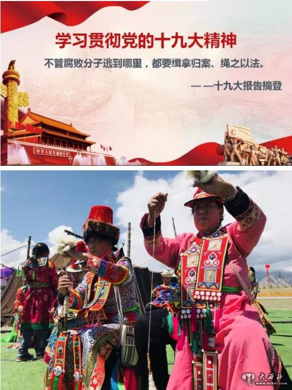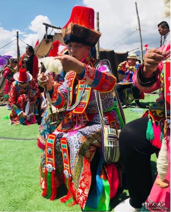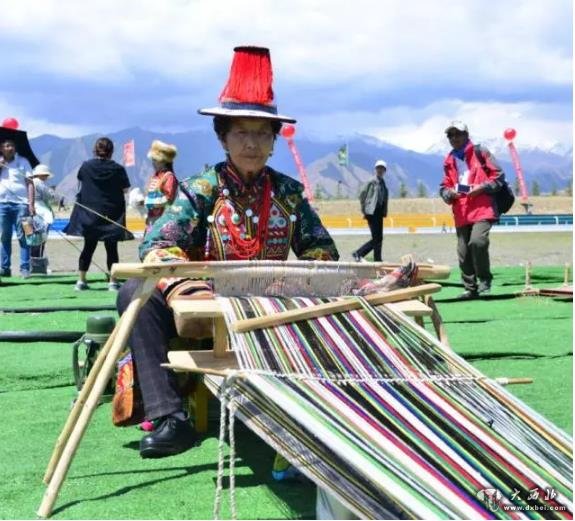 “铿铿,铿铿……”一种沉闷而有规则的撞击声在耳边响起,一位身着民族盛装的老奶奶,坐在一条五彩布带上操作着简易的纺织设备,她手指灵巧地将纬线从经线中穿过,再用一把厚实的纺刀用力地“剁”紧纬线,再一拉横木,那些横着的、竖着的彩色毛线就被紧密地“织”在了一起,然后再重复上面的动作。这位老人叫安玉,她也是一位非物质文化遗产传承人,她正在演绎“织褐子”,她说:“羊毛细了捻线很困难,织褐子的时候容易断,以前我们都用土种羊毛织”。