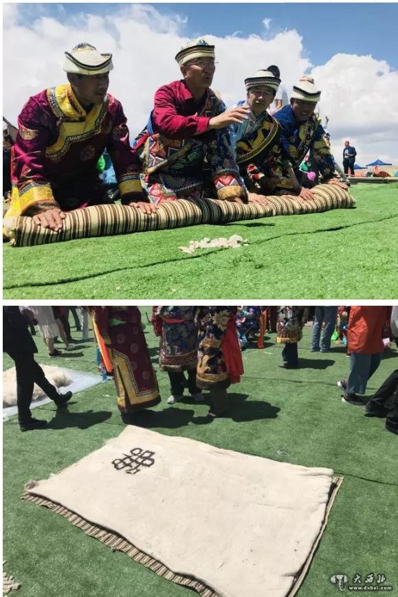 在欢快的祝词声中,“擀毡”活动开始了,“爸爸,这些白石头是做什么用的?”,游客张先生的孩子对擀毡老人面前放的白色石子充满了好奇,老人向他们解释说,白色石头是用来计数的,一块石头代表擀了一百下,张先生和儿子不约而同的点点头。这位老人叫孟先忠,他是一位裕固族口述非物质文化遗产传承人,他说:“擀毡之前先要唱祝词,四五个人跟着节奏同时用力,一点也不累。如果要做毡帽,需要擀三千多下,如果做褥子,擀几百下就好。”现场观众听得津津有味,市民安先生激动的说:“这些场景只在小时候见过,现在能看到的机会越来越少”。