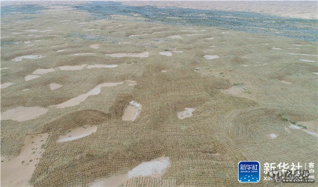 绵延的腾格里沙漠一望无际,在位于宁夏、内蒙古交界处的长流水沙治项目区,每天都有上千亩的流动沙丘被草方格紧紧锁住。