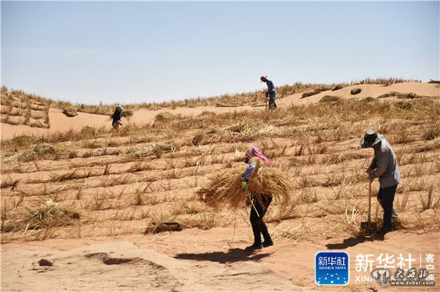 女人们将麦草均匀地铺在沙子上,男人们拎起铁锹把麦草扎进去。“从麦草的中间扎下去,入沙10公分,露出30公分左右。草扎直立,横竖成行,间距1米。”郑自华向记者描述着技术要领,手中铁锹移动的频率丝毫没有被打乱。