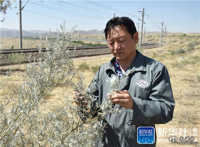 ↑宁夏中卫固沙林场副场长郜永贵在查看包兰铁路沿线的植被(6月12日摄)。新华社记者卢鹰摄
