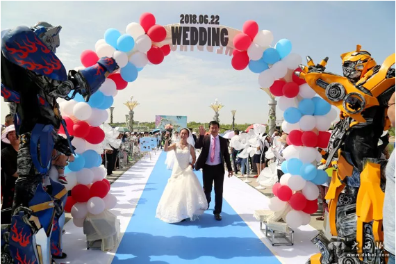 来自北京、广东、陕西、青海、宁夏等17个省市的56对新人或情侣西装笔挺、白纱披身,面带幸福笑容,在金水湖畔见证爱情的浪漫,在花城播撒下爱的种子。机器人嘉宾“擎天柱”和“大黄蜂”也齐亮相,恭贺新人新婚之喜。