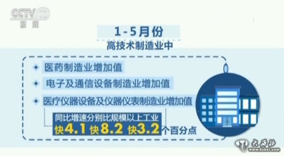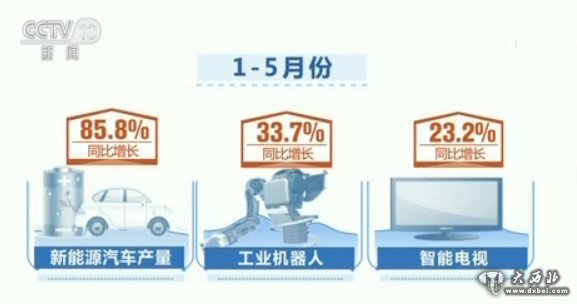 实体经济发展向好的同时,工业结构不断优化,向中高端迈进势头明显。1到5月份,高技术制造业中,医药制造业、电子及通信设备制造业、医疗仪器设备及仪器仪表制造业增加值同比增速分别比规模以上工业快4.1、8.2和3.2个百分点。低碳化、智能化、网络化、信息化快速发展,新产品大量增加。1到5月份,新能源汽车产量同比增长85.8%,工业机器人增长33.7%,智能电视增长23.2%,3D打印设备、石墨烯等产品快速增长。