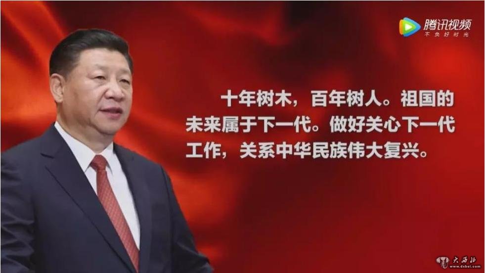 习近平总书记深刻指出,十年树木,百年树人。祖国的未来属于下一代。做好关心下一代工作,关系中华民族伟大复兴。(摘自习近平总书记在纪念中国关心下一代工作委员会成立25周年暨全国关心下一代工作表彰大会上的发言)。
