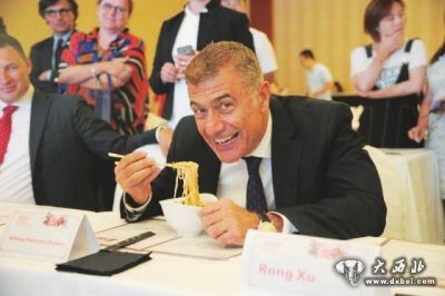 在罗马喜来登酒店,代表两碗面的中西方名厨上演精彩对决,为现场的100多名中意嘉宾带来一场“美食盛宴”。兰州牛肉拉面第四代传人马文斌现场展示拉面制作工艺。只见一块长约20厘米、直径约4厘米的面团剂子,在马文斌手中就像变魔术一样,眨眼之间就被拉成了大宽、宽、细、二细、三细、毛细等粗细不等的面条,出神入化的技艺令现场从未见过此项技艺的意大利嘉宾拍手叫绝。