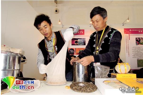 李兴昌(右)与李明泽(左)在制作普洱茶。