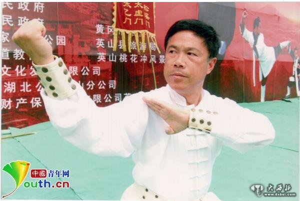 2007年5月在英山县举办的第一届“南武当杯”国际武术节上,岳家拳传承人张业金现场表演献技。