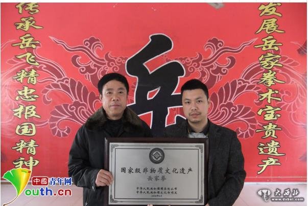 2008年,岳家拳正式被国务院批准为国家级非物质文化遗产。张业金(左)与张奇钢(右)从北京捧回岳家拳非遗匾。