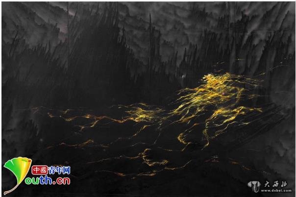 金线用苏绣典型的平针绣法绣在真丝底料上,明暗金黄色从近处向远处延伸,灯光照射下,一如夜空中的万家灯火。若有灯光照射,参观者会发现整个底料上还暗藏一幅泼墨山水画。