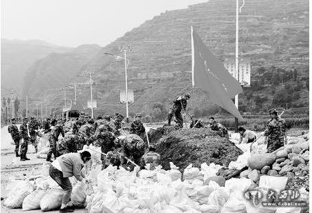 7月6日,武山县马力镇民武村防汛救灾抢险现场一派忙碌。武山县组织驻地部队官兵、县直单位干部和群众一起,积极投入到防汛救灾工作中。本报记者李小龙