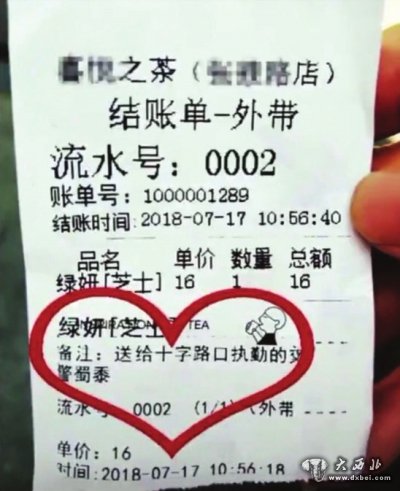 记者了解到,强生奇收到的是消暑饮品,外卖单上备注道:“请您送给十字路口执勤的交警叔叔!”