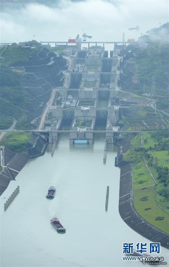 船舶有序通过三峡五级船闸(2017年10月4日摄)。截至2017年9月底,三峡船闸、葛洲坝船闸累计客货通过量双双突破1亿吨,有效发挥了三峡枢纽航运效益。新华社发(郑家裕摄)