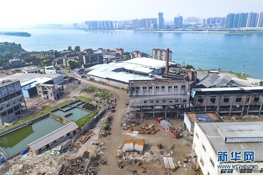 宜昌田田化工有限责任公司拆除现场(4月30日无人机拍摄)。2017年以来,湖北省宜昌市把修复长江生态放在重要位置,制定3年行动方案,计划到2020年,陆续关、搬、转134家化工企业,最终实现沿江1公里范围内化工企业全部“清零”。新华社记者肖艺九摄