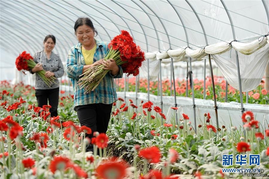 在江西省靖安县水口乡桃源村,当地农户在非洲菊种植基地采摘花卉准备外销(2017年4月20日摄)。坐拥整个鄱阳湖流域、正处工业化发展中期的江西,将为长江经济带生态文明建设寻找答案,给全国生态文明建设摸索标准,探索一条通向美丽中国的绿色崛起之路。新华社记者彭昭之摄