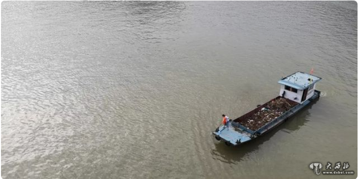 ↑7月30日,重庆市巫山县九码头附近江面,环卫工人正在清理江面漂浮垃圾。新华社记者金立旺摄