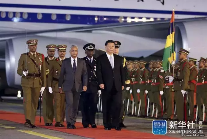 7月27日,国家主席习近平抵达毛里求斯共和国,过境并进行友好访问。毛里求斯总理贾格纳特在机场为习近平举行隆重欢迎仪式。在贾格纳特陪同下,习近平检阅仪仗队。新华社记者丁林摄