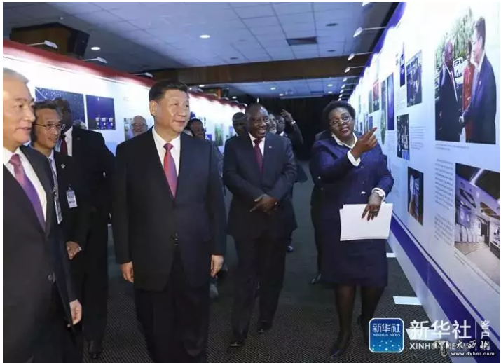 7月24日下午,南非科学和工业研究理事会国际会议中心展览厅。习近平主席同拉马福萨总统一起参观中南科技创新合作成果图片展。