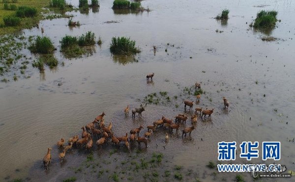 一群自然野化的麋鹿在湖南东洞庭国家级自然保护区内活动(2017年5月10日无人机拍摄)。 新华社记者 李尕 摄