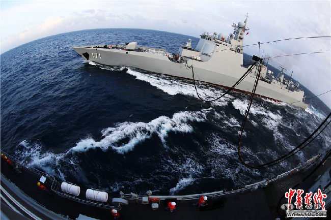 2017年2月6日,海口舰参加远海训练,图为海口舰进行横向补给。时明华摄