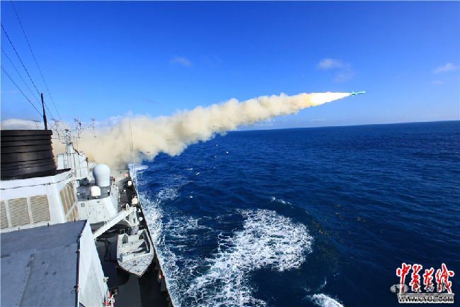 2008年11月8日,海口舰在某海域参加实弹演习,图为海口舰发射反舰导弹。