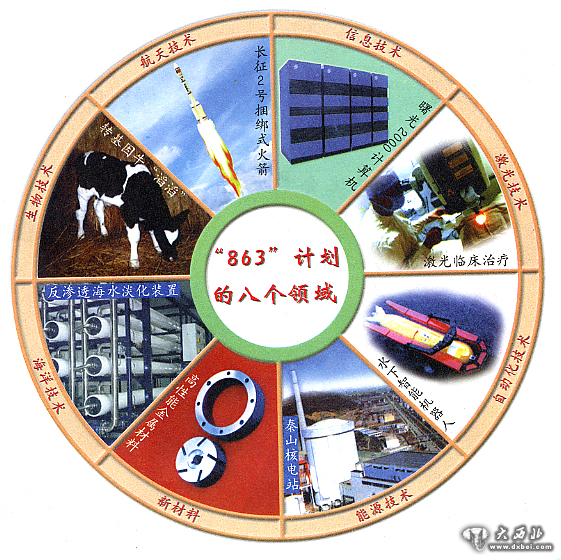 1986年3月提出的863计划,在经过一百多位科学家半年多的反复论证,形成为《863计划纲要》,选择生物技术、航天技术、信息技术、激光技术、自动化技术、能源技术和新材料七个领域作为我国发展高科技的重点,1996年又将海洋高技术列为计划的第八个领域。