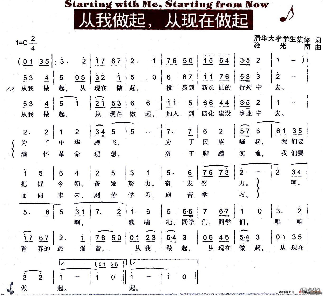 图为《从我做起,从现在做起》的曲谱。(来源:中国曲谱网)